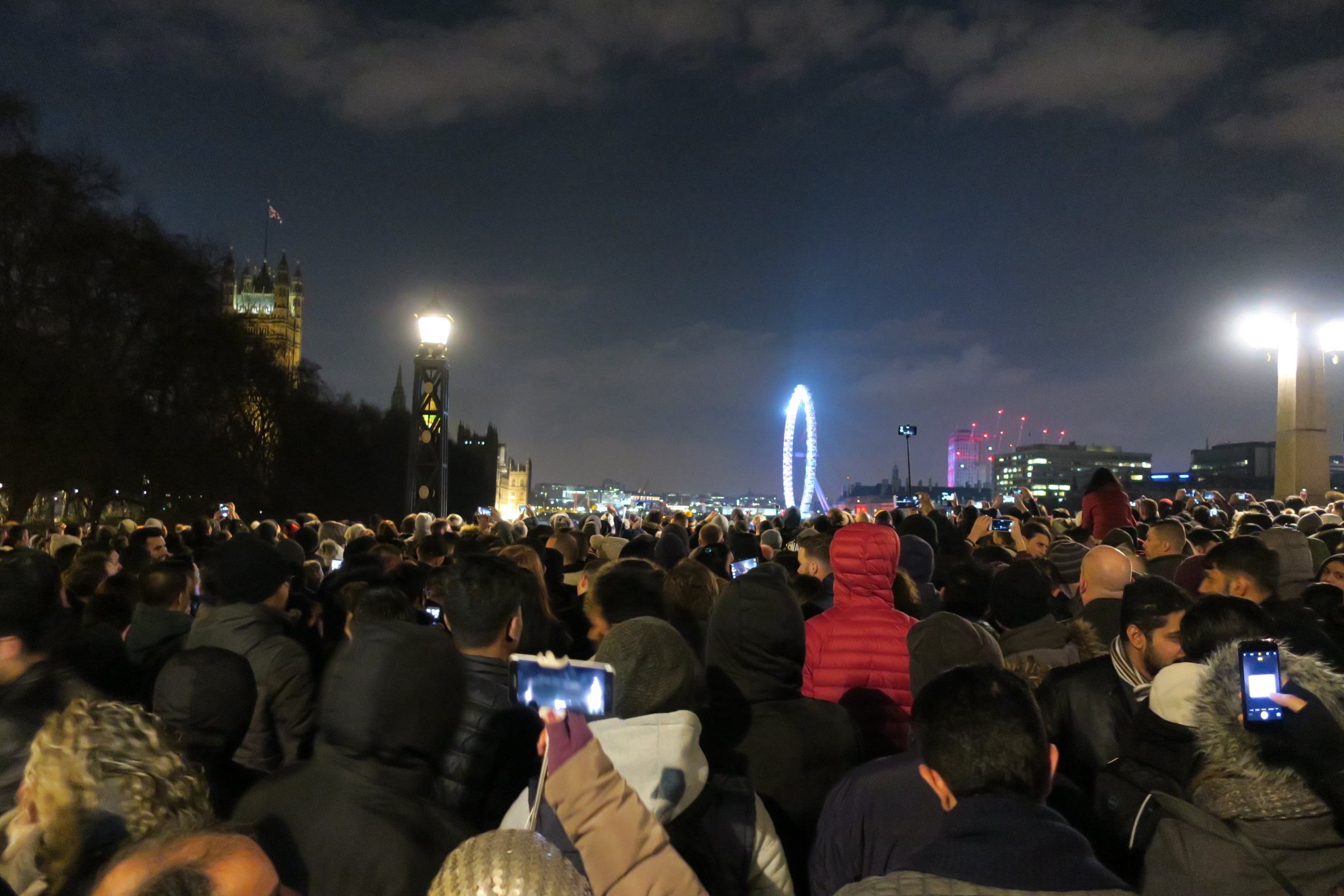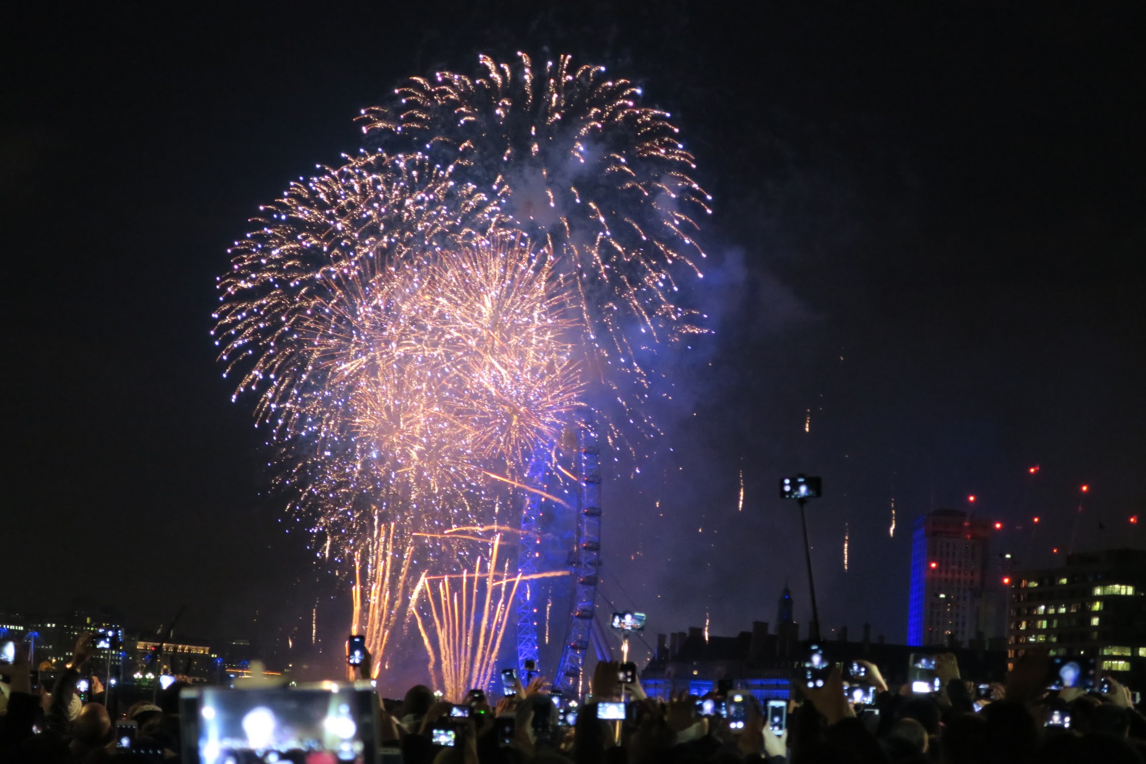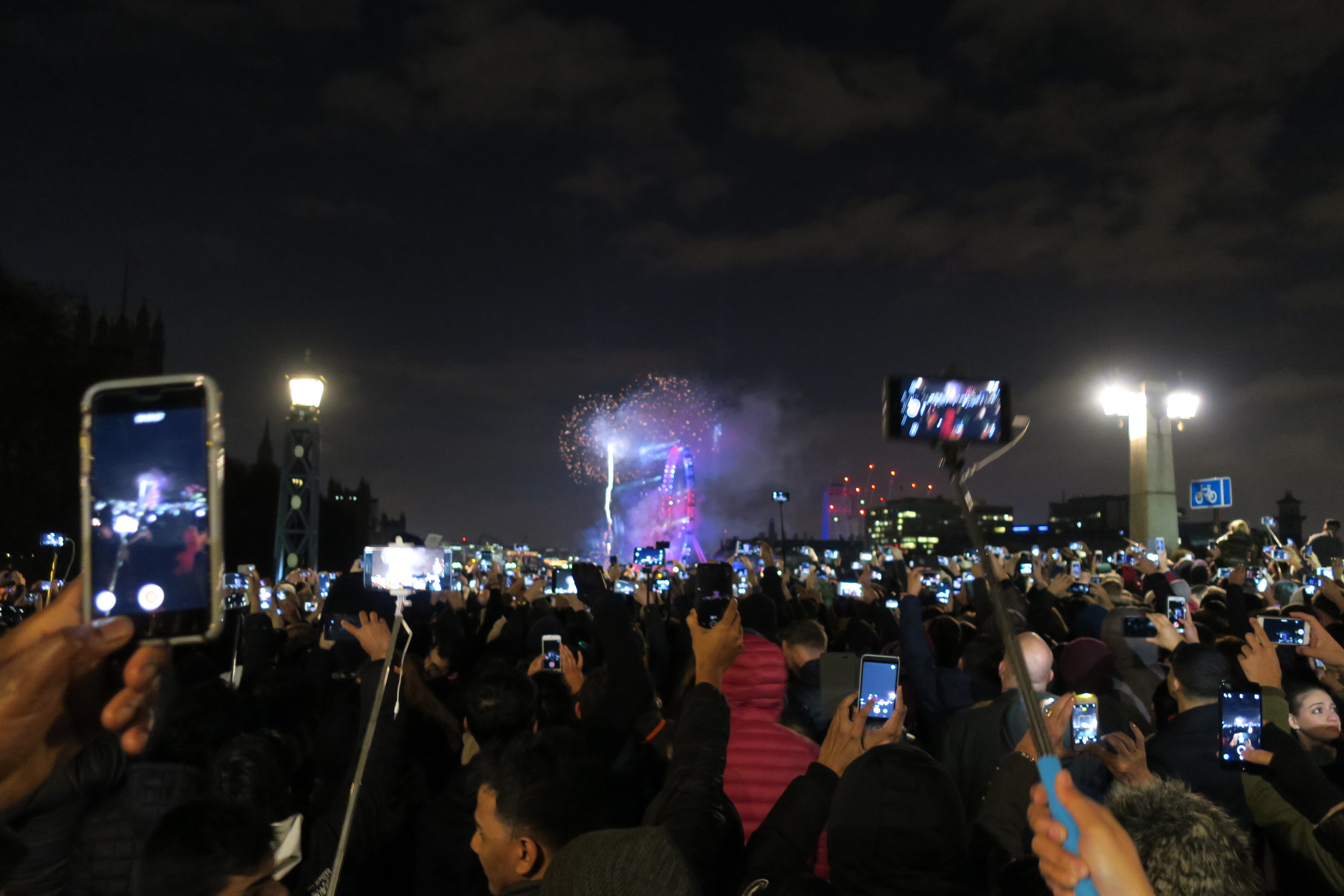 年越しビデオあります。https://youtu.be/yVz3Kwqi9e0 その後10分ちょっとで12000発の花火が上がります。 ロンドン・アイ(観覧車)からも横向きに花火が噴射するという異例の花火もあります。すごい歓声ですっ!