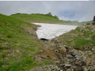 | 更に約1時間のトレッキングです。前回来たときは岩の道で少々しんどかったのですが、木道っぽい良い登山道ができていてとても楽に登ることができました。こうやって雪渓や高山植物を見ながらのんびり登れます。超涼しいですし。(てゆうか、雪が溶けないほど寒い) |