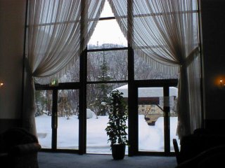 朝になりました。ホテルの窓です。明るくなってきれいな雪がくっきり見えました。 |