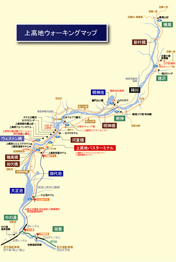 【上高地】 バスは河童橋まで行きますが、手前の田代池で降りました。午前中はここから河童橋を目指してトレッキングです。 (English map is here) |