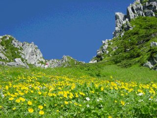 登山途中です。ミヤマキンバイが満開でした。(ミヤマキンポウゲ?)空の青さは信じられないぐらい美しかったです。 |