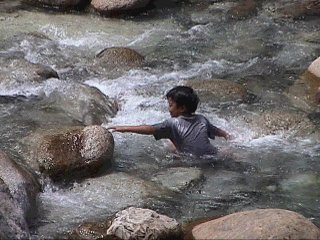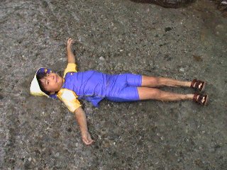 川あそびです。すばらしく美しい川の浅瀬で寝転んでいます。大人にはできません。こんな冷たい水では。 |