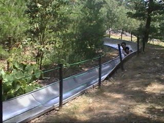 次の日はキャンプ場にあるボブスレーに乗りました。山の上までロープでひぱってくれます。ジェットコースターさながらに森林の中を滑り降ります。ブレーキもついているのでカーブの前では減速!の看板が並んでいます。どこまでブレーキをかけずに滑り降りるかが度胸試しです。(300円/1回,1500円/6回) |