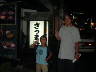 そして市内の西田温泉に行きました。ここは家族風呂もあって、とてもよかったです。家族風呂は広い休憩部屋と石板を貼った風呂があります。和室タイプや洋室ソファータイプも選べて、時間制限もなくとてもよかったです。1500円(家族で)+100円(クーラー利用料)でした。おすすめです。お風呂中にフィールドアスレチックでどろどろになった服をコインランドリ−で洗濯したりしていたので、すっかり辺りは夜に。夕食は市内の郷土料理居酒屋です。 |