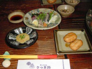揚げたてのさつま揚げ。そしていかなごの酢味噌、かつをのたたきです。さつま揚げは揚げたてが最高ですね。 |