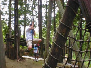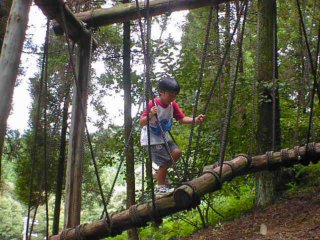 ここにはフィールドアスレチックもありました。息子は初体験、親は中学生以来です。できるかな!? |