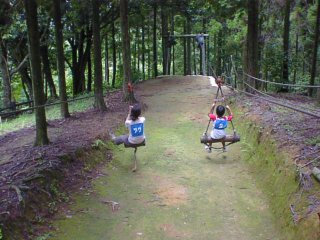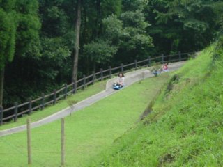 県民の森には写真のようなボブスレーがありました。信州の駒ヶ根家族旅行村にもありましたが、あそこはジェットコースター方式で乗ってから山を登りますが、ここのはいきなりダウンヒルです。そして下までいったら歩いて登るか、車でだれかが迎えにいくか。歩いてなんかいられないので女房と交互で滑りました。急な長い坂で、トンネルもあってスリル満点です。息子は初めてひとりでボブスレーをやりました。さすが小学生です。ちょっとびびってましたが、できるとわかってからはとばしまくりでした。遊園地のジェットコースターは絶対乗らないくせに。 |