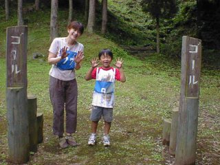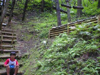 息子は写真右上の釣り下がっている丸太から滑り落ちて斜面を頭から滑走して座っている階段まで落ちました。ヒヤリとしましたが、地面もやわらかく草の上でしたのでかすり傷ひとつなくほっとしました。 |