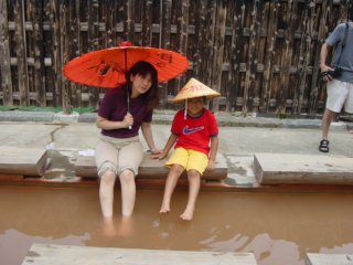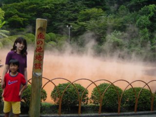 血の池を足湯でいただきました。熱い! |