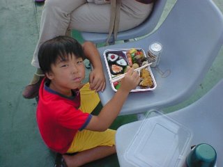 船上デッキではJR別府駅で買った「おふくろ弁当」で夕食です。 |