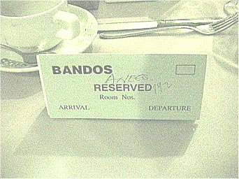 バンドスのメインダイニングでは滞在中ずっと同じ席を用意してくれます。192号室のリザーブカードです。給仕のAneesさんのサインもあります。 | |