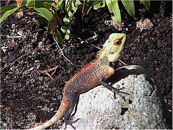とかげ。カメレオン調のおしゃれなとかげがうろちょろしています。リスのように木ではしゃいでいます。 | |