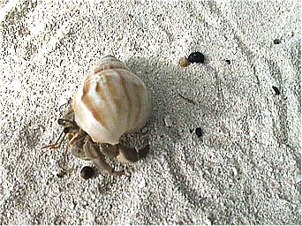 やどかり。こんなに多くのヤドカリをみたのは初めてです。どれも大きく、木にも登ります。背負っているのは元かたつむりのそれです。 | |