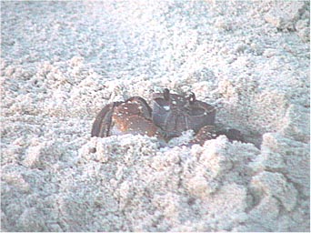 カニです。横だけでなく前にもすばやく移動します。夕日が真っ赤に染まるころ、砂浜を占領します。すごい数でした。 | |