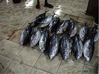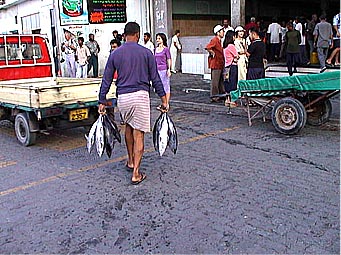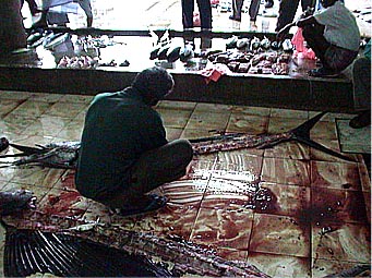 市場でカジキマグロをさばき、切り売りするオヤジ(内臓もちゃんと売っていました。) | |