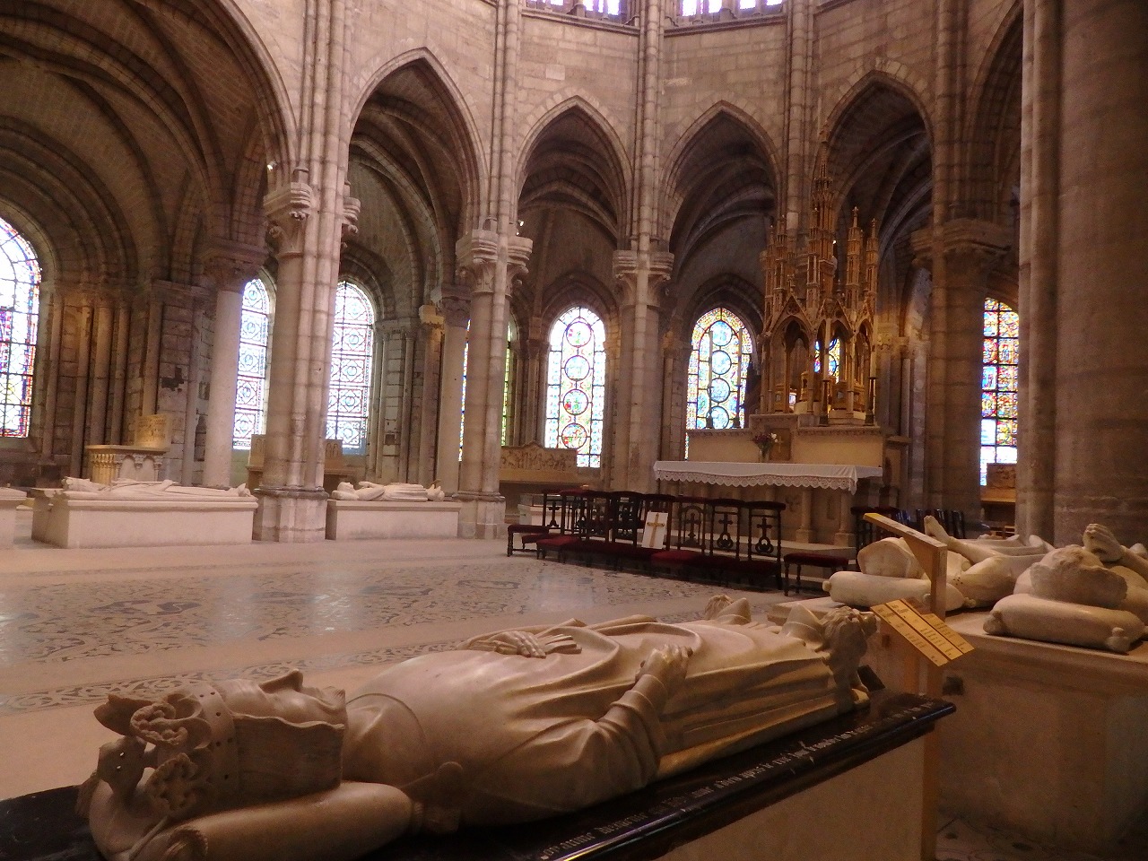 「サン・ドニ大聖堂」 内陣の周りにも多くの王たちが眠っています。斬首されたルイ16世と妻、マリー・アントワネットは当初、サン・ドニに埋葬されませんでした。ナポレオンがエルバ島に流されている間に復興ブルボン朝は彼らの遺体の捜索を命じました。王のものと思われるいくつかの骨、女性のガーターを含む灰色の塊といった遺品が1815年1月21日に発見され、それらはサン・ドニに運ばれ新しいブルボン地下墓地に埋葬されました。