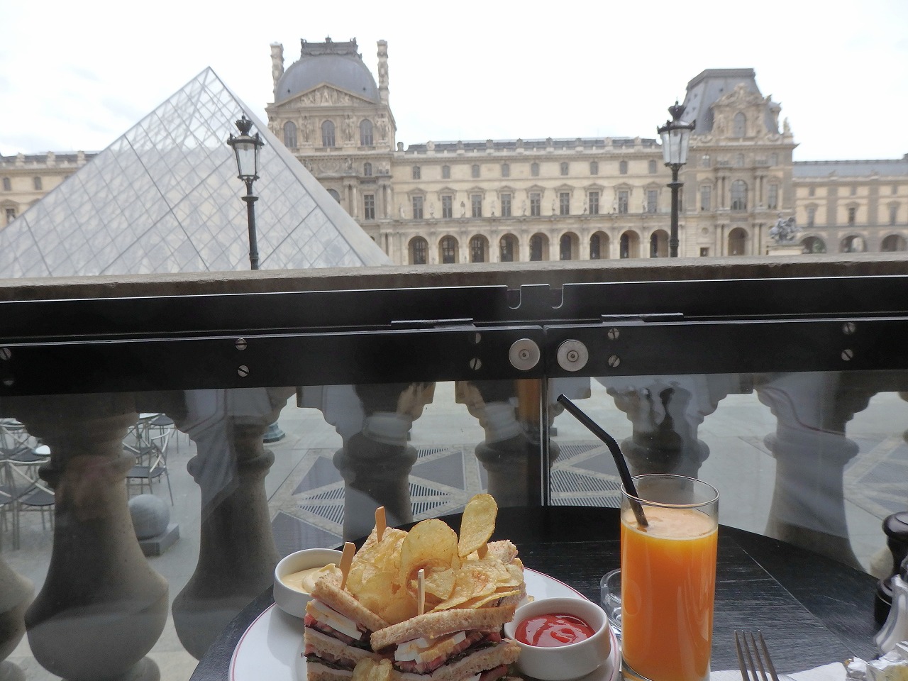 "Cafe Marly" I was hungry because I had only a lunch of Thalys and ice creams. Therefore I wanted to eat a snack, but it wasn't light at all. The juice was squeezed out of the oranges. It was 9 Euros. |