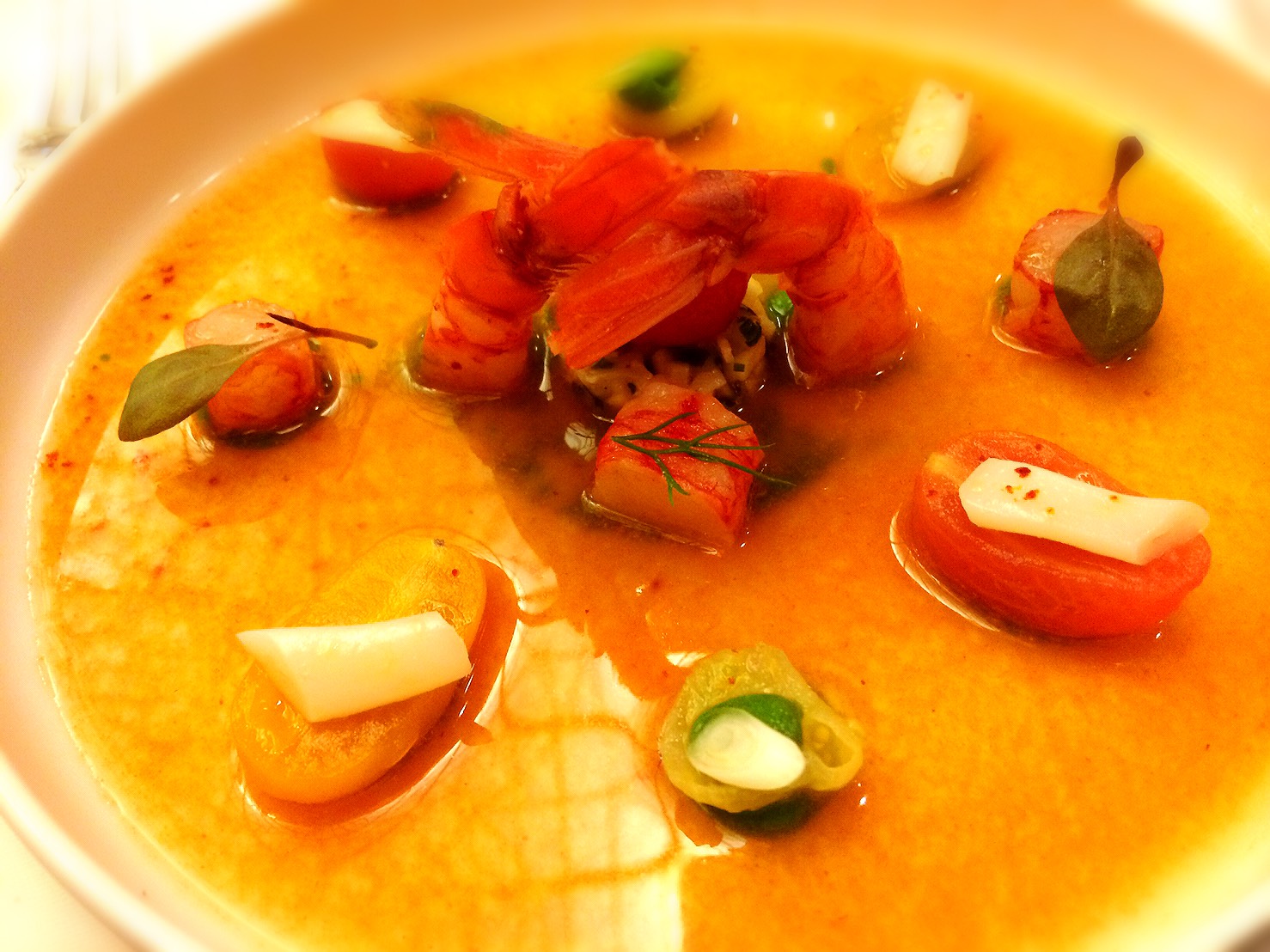 Hors d'oeuvres. Red prawns, razor clams and tomatoes. |