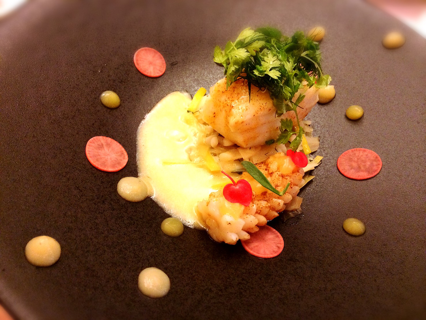 A main dish. We chose the fish. It's a freshwater fish called the wild zander. We ate with a curry sauce. |