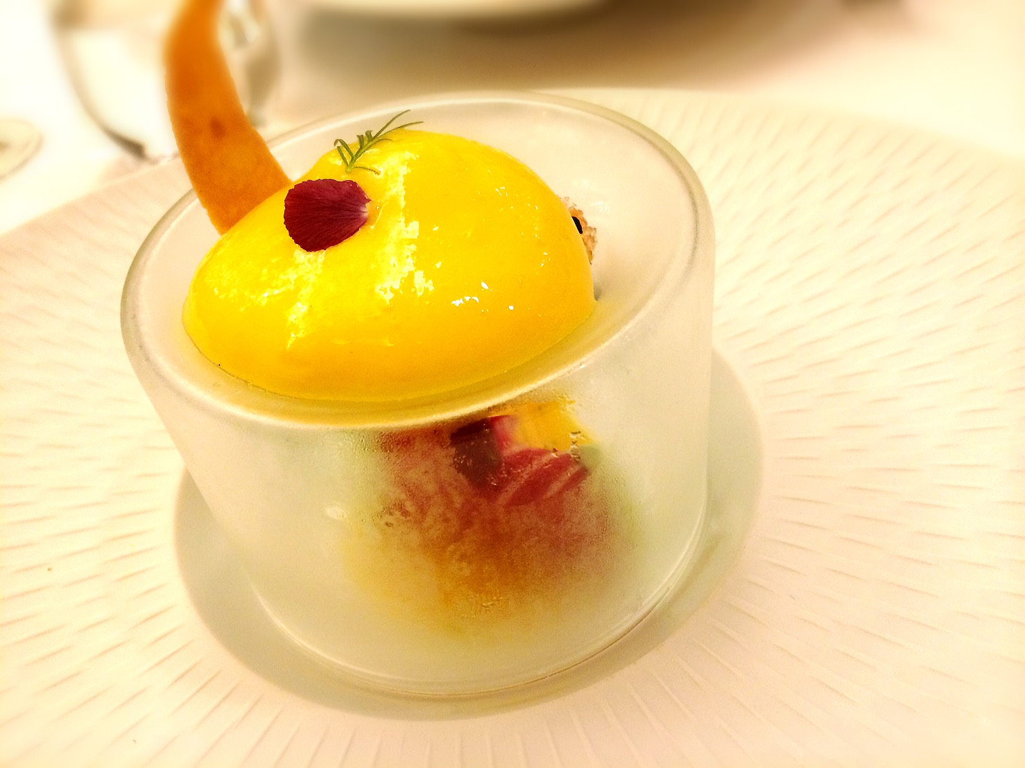 The first dessert. It consists of two tiers. The first tier is a mango sorbet. I thought a mango was served as it was. |