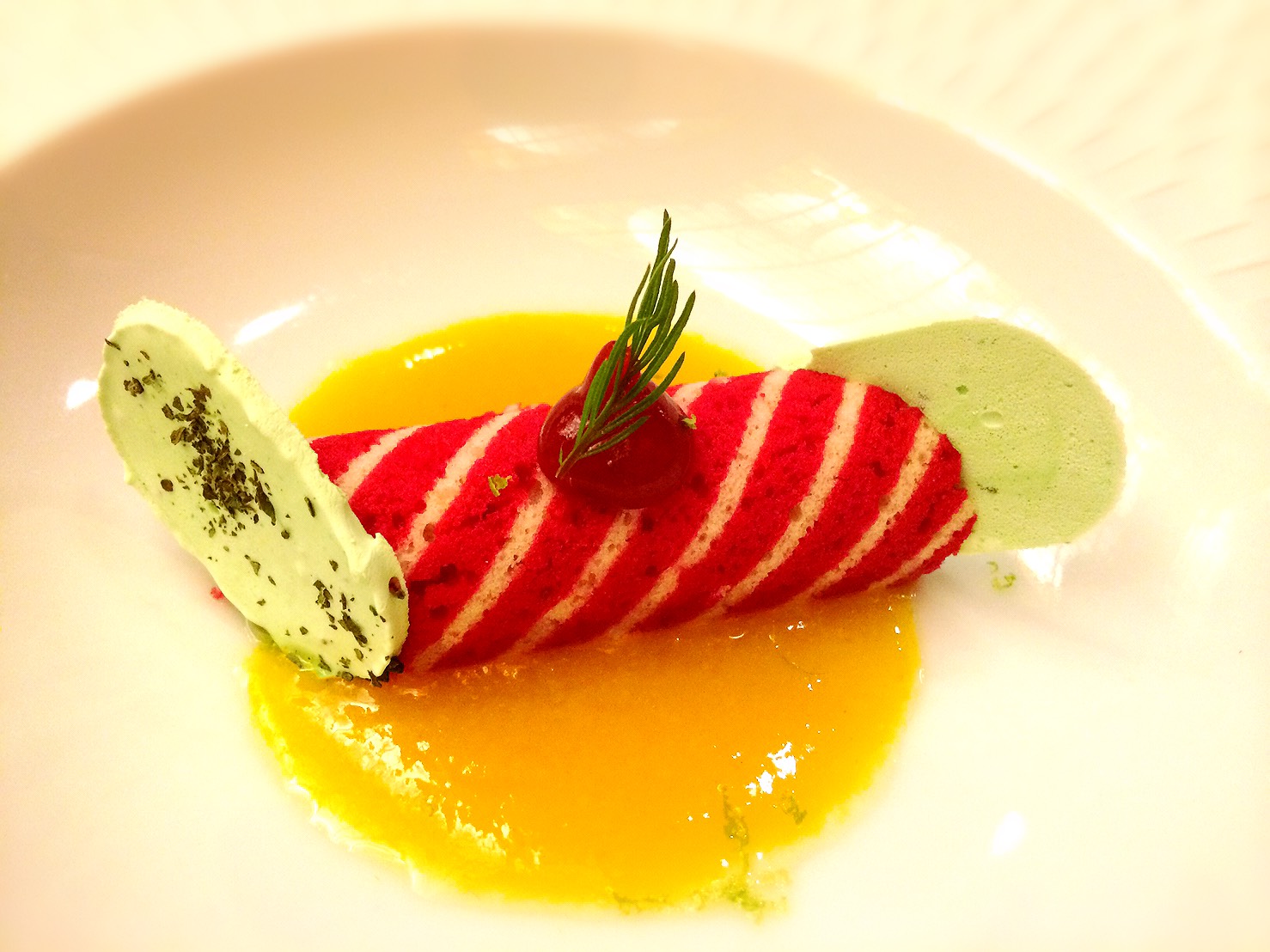 デザート二つ目。ガラスの器をとると出てきました。Jocondeというスポンジ・ケーキです。ジョコンデ・スポンジは層になっているアーモンド風味スポンジケーキです。
