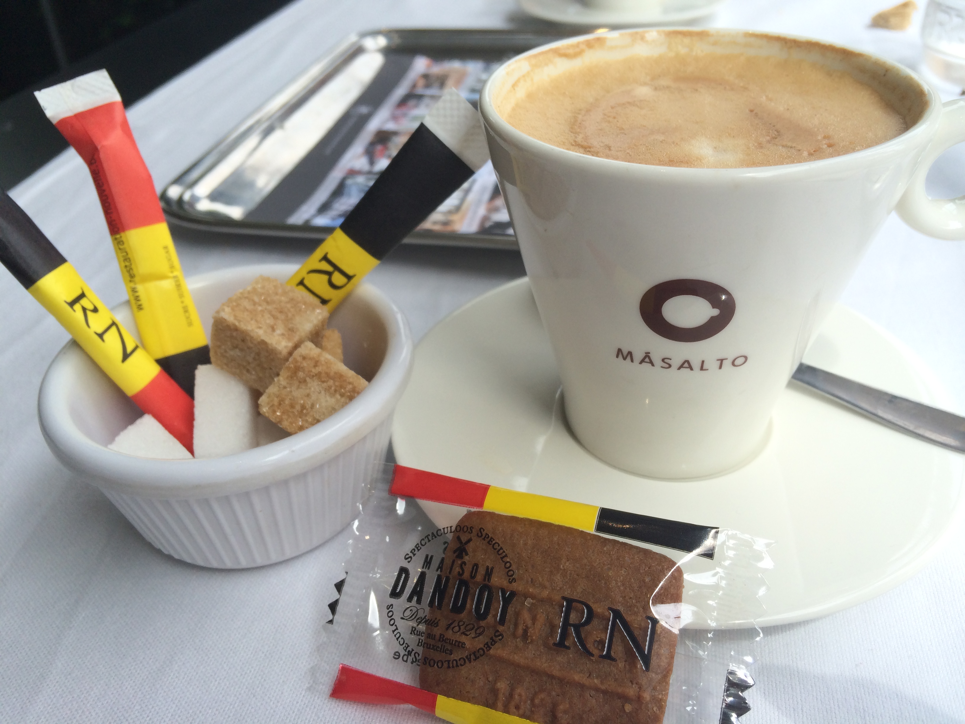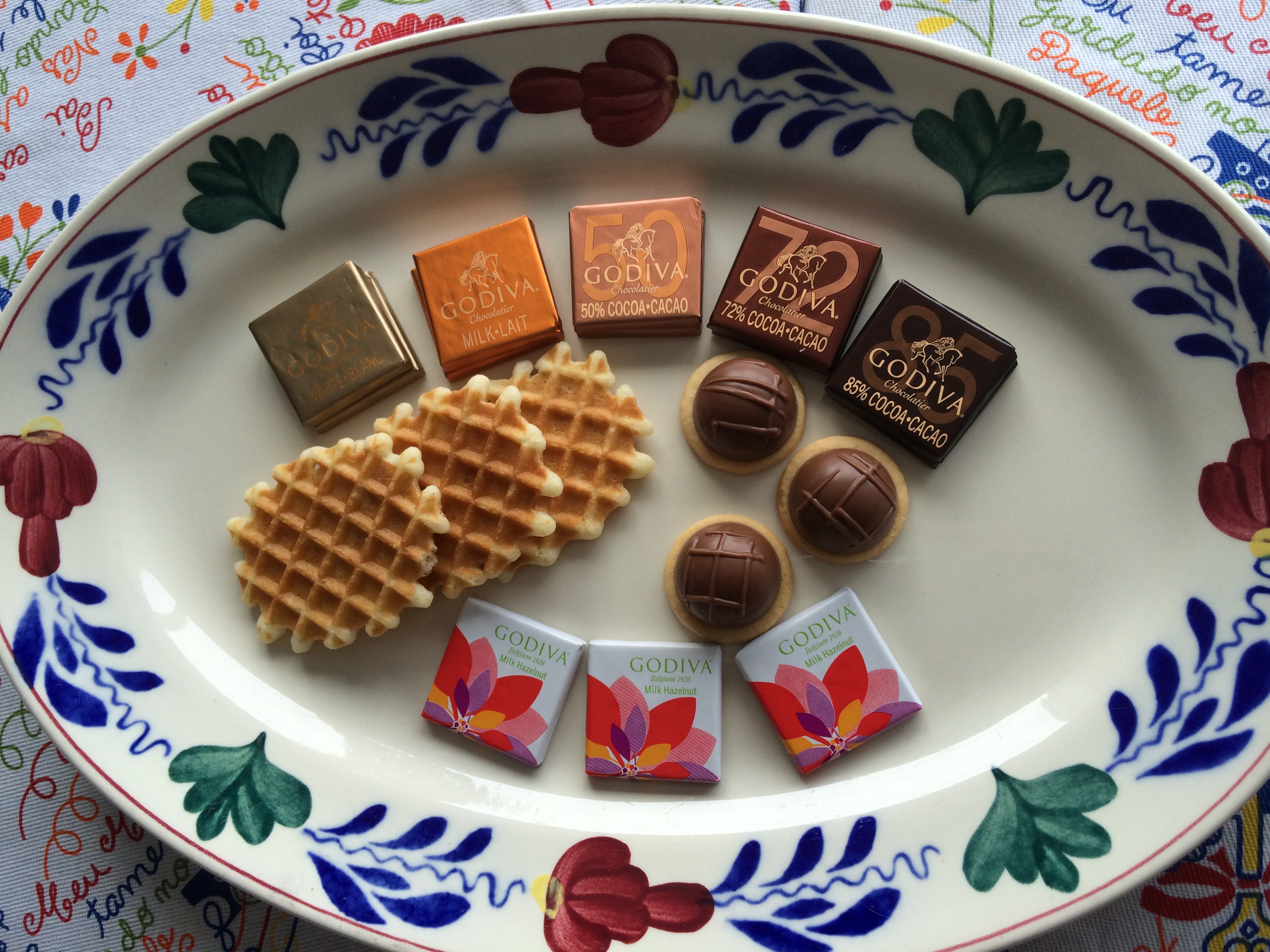 おうちでお茶会。 ボックのお皿にゴディバのチョコ、ジュールス・デストルーパーのバターワッフル。みーんなベルギーのだよ。