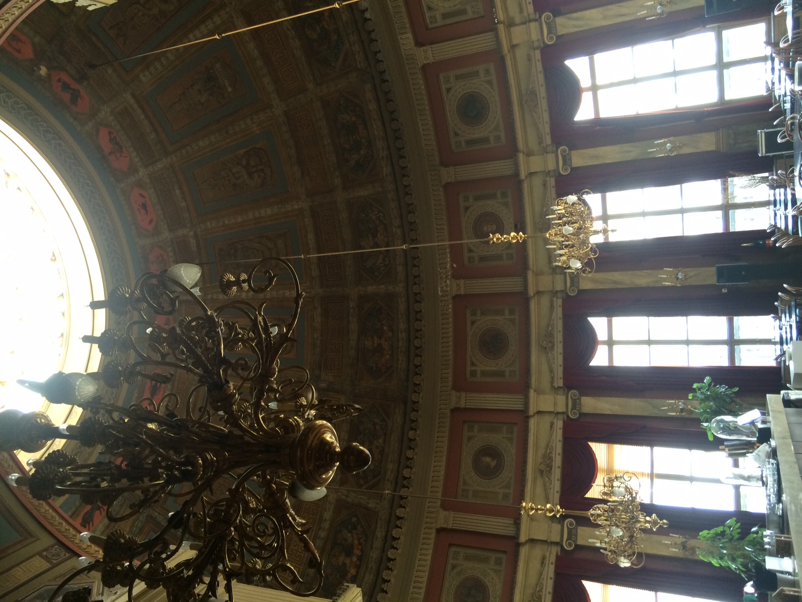 アントワープ「デ・フォイエ」 半ドームの高い天井と豪華なシャンデリアが印象的なレストラン。ここでランチをと思っていたら今は週末のみ営業なのだそう。