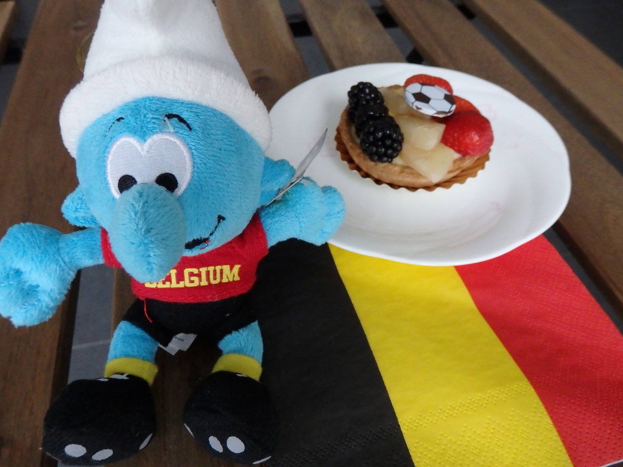 ベルギーでケーキを買うとこんな感じ。 スマーフもサッカーシューズを履いています。