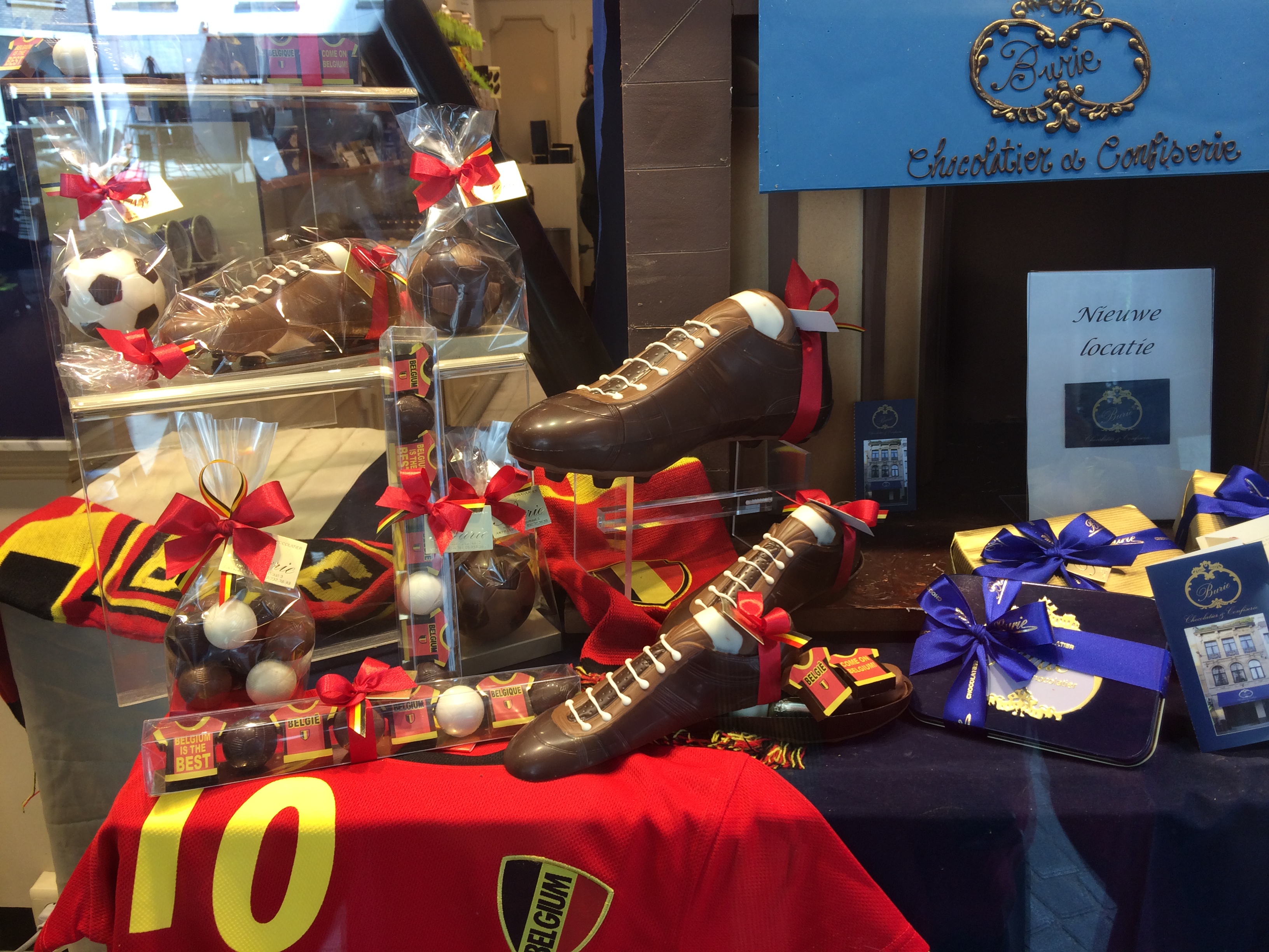 アントワープの「ブリー」。ディスプレイももちろんサッカー仕様です。サッカーボールやサッカーシューズ型のチョコ。大小取り揃えて売られていましたよー。