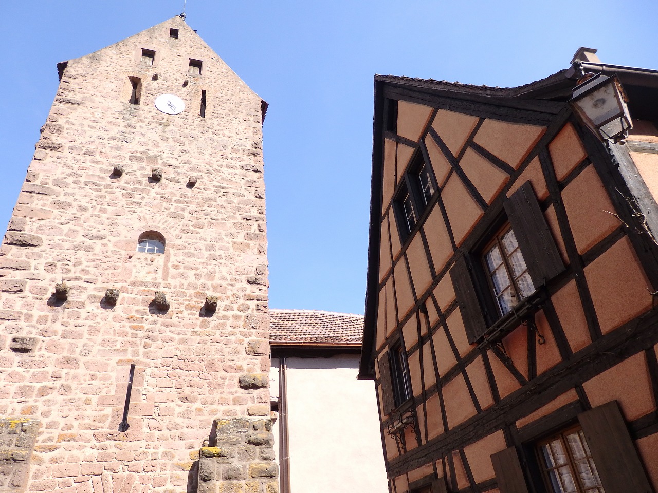 「ドルデーの塔」が見えてきました。塔は市壁と同時にリクヴィルへの入口として1291年に建設されました。鐘楼に設置された見張塔を利用して外敵の進入に対する村の防御のために使われました。ドルデーはアルザス語で「最も高い所」を意味します。鐘楼の高さは25メートルです。