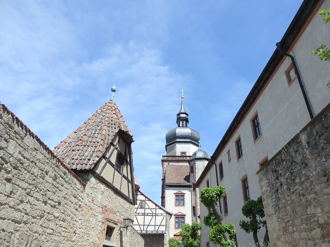 到着。古代から砦だったこの建物は、この地方の司教の住居として5世紀近く使われました。現在の建物の大部分は16世紀から18世紀にかけてルネサンス及びバロック様式で建築されました。30年戦争中の1631年のスウェーデン王グスタフ・アドルフの占領中にバロック式住居として再建されました。ウォルツブルグ司教の住居としての役割を終えた後は18世紀後半から19世紀の戦争で再度、砦としての役割が与えられました。