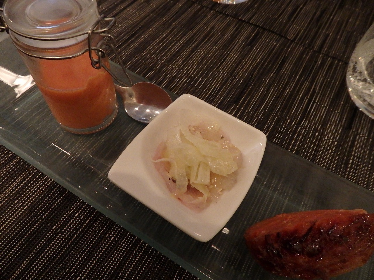 アミューズ。トマトの冷製スープ、魚のカルパッチョ、新玉ねぎとチョリソー。玉ねぎが甘くてとても美味しかったー