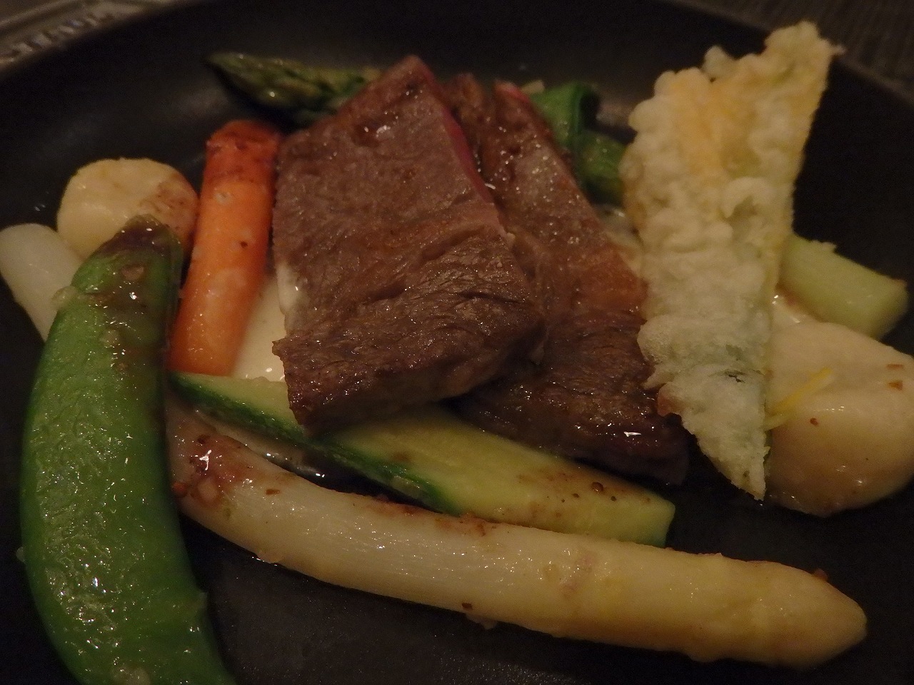 お肉料理。和牛のステーキ。季節のホワイトアスパラやズッキーニの花の天ぷらも美味しい。