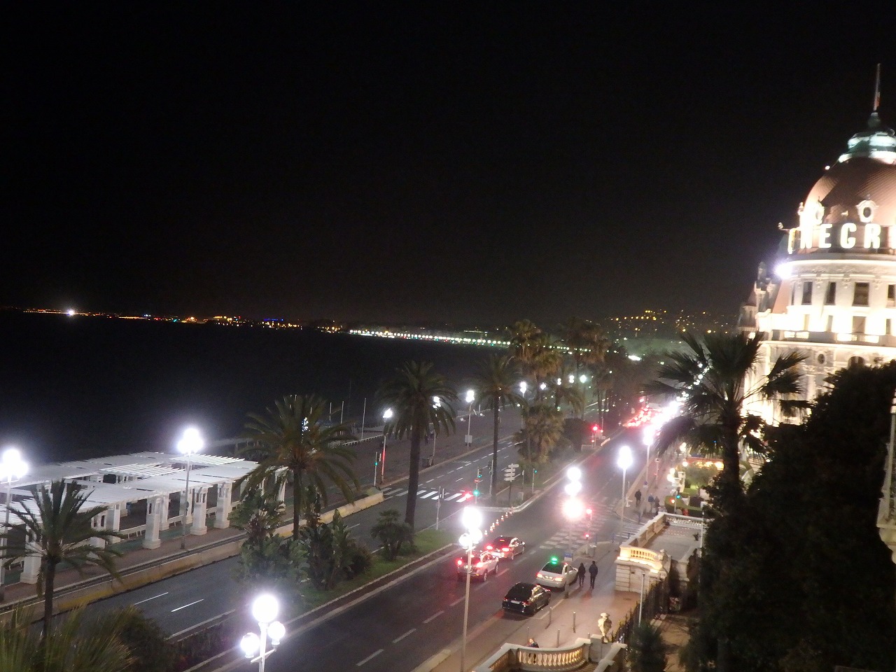 "The Promenade des Anglais ("Promenade of the English") " from the room of the hotel. In the second half of the 18th century, many wealthy English people took to spending the winter in Nice, enjoying the panorama along the coast. Bonne nuit. |