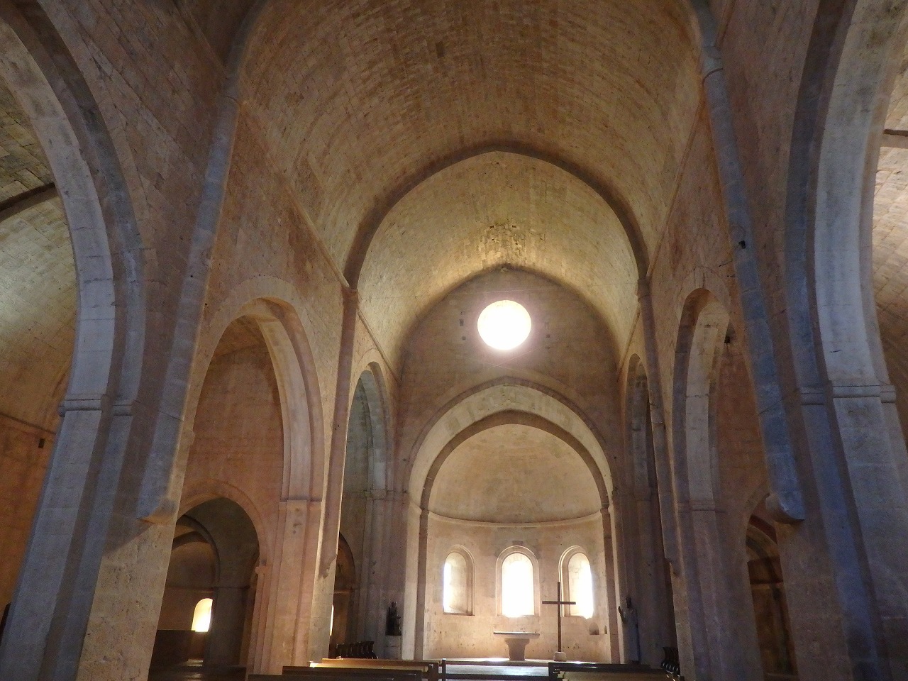 教会。半円筒形の天井は非常に固い石灰質の石が正確に切り出され、モルタルを使わず、1センチの隙間もなく積み上げ、つくられています。18世紀に修道院長は聖職者の規則が厳しすぎるとして彫刻や噴水、クリの並木道等の装飾を加えました。修道院は大きな借金を負い、1785年に修道院長は破産を申告しました。