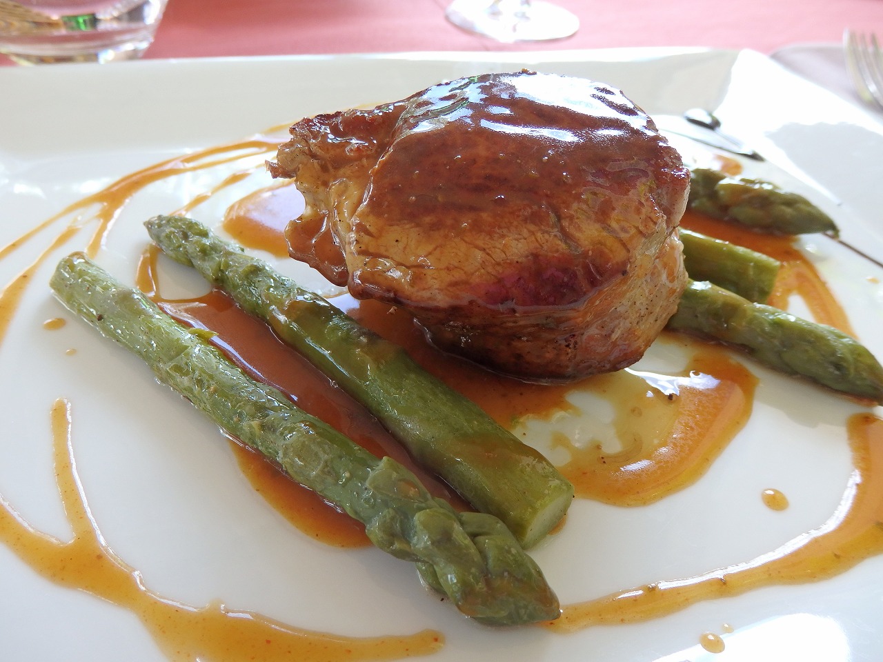 A dish of meat. A steak of "wagyu". White asparagus of the season and tenpura of zucchini flowers are nice, too. |