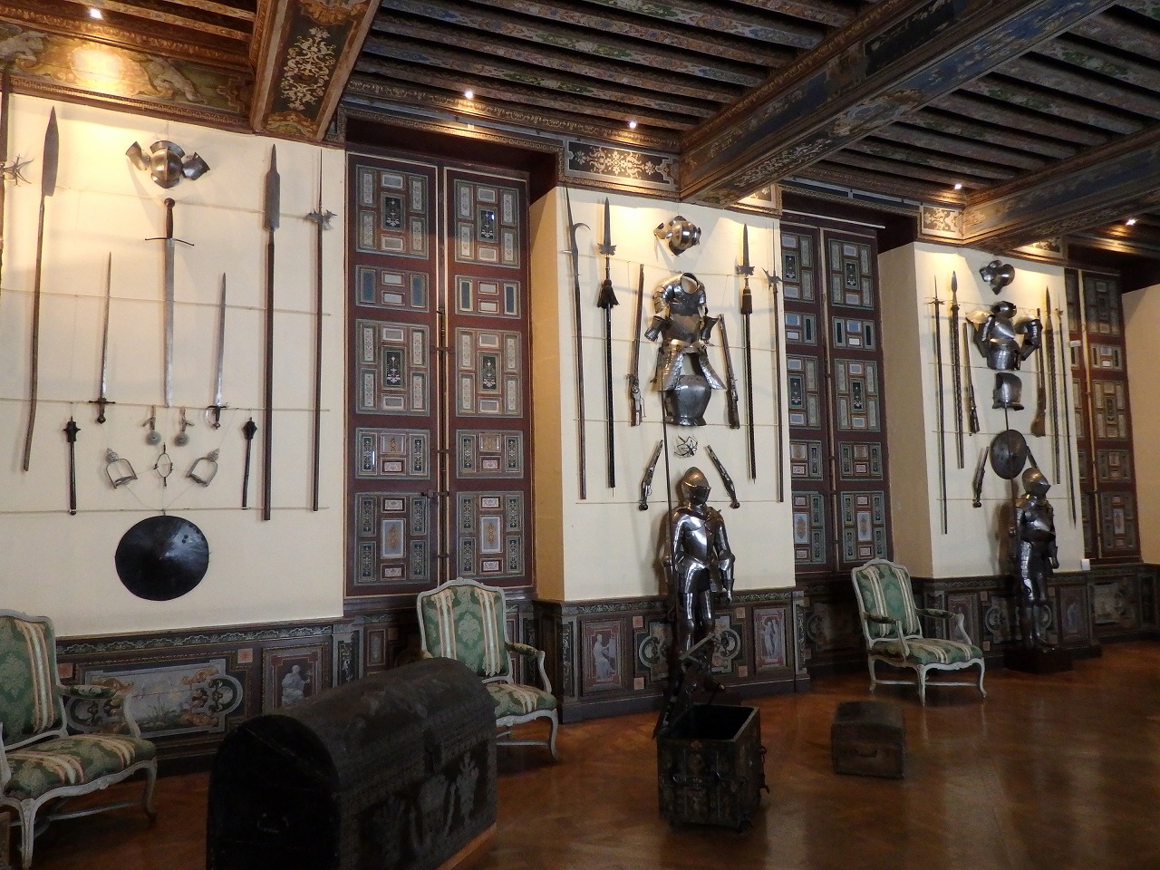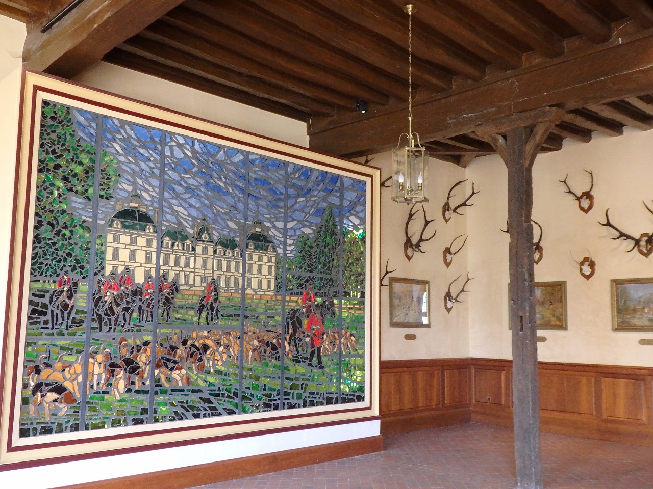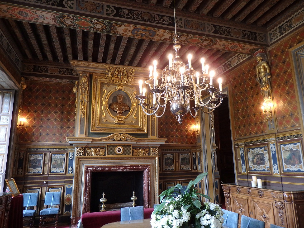 狩猟の離宮だったからね。こんな飾りがたくさんあります。広大な部屋、開放された窓、高い天井は暖房がほとんど意味をなさないことを意味しました。同様に城の周りには村や住居がなかったため、役に立つ食材は狩猟で採った動物のみでした。そのためすべての食材は大抵一度に2000名にも及ぶ人々によって運び込まれました。