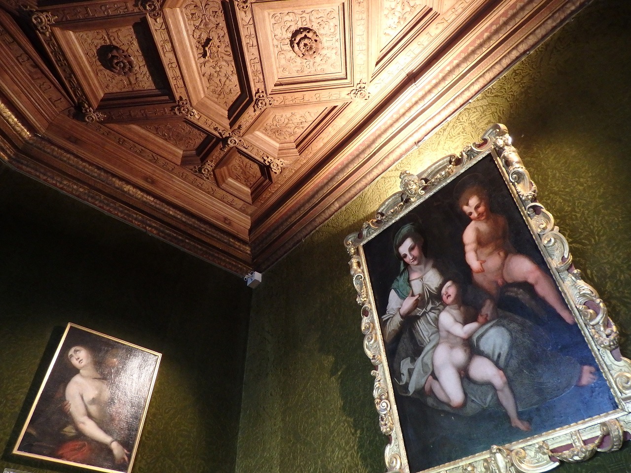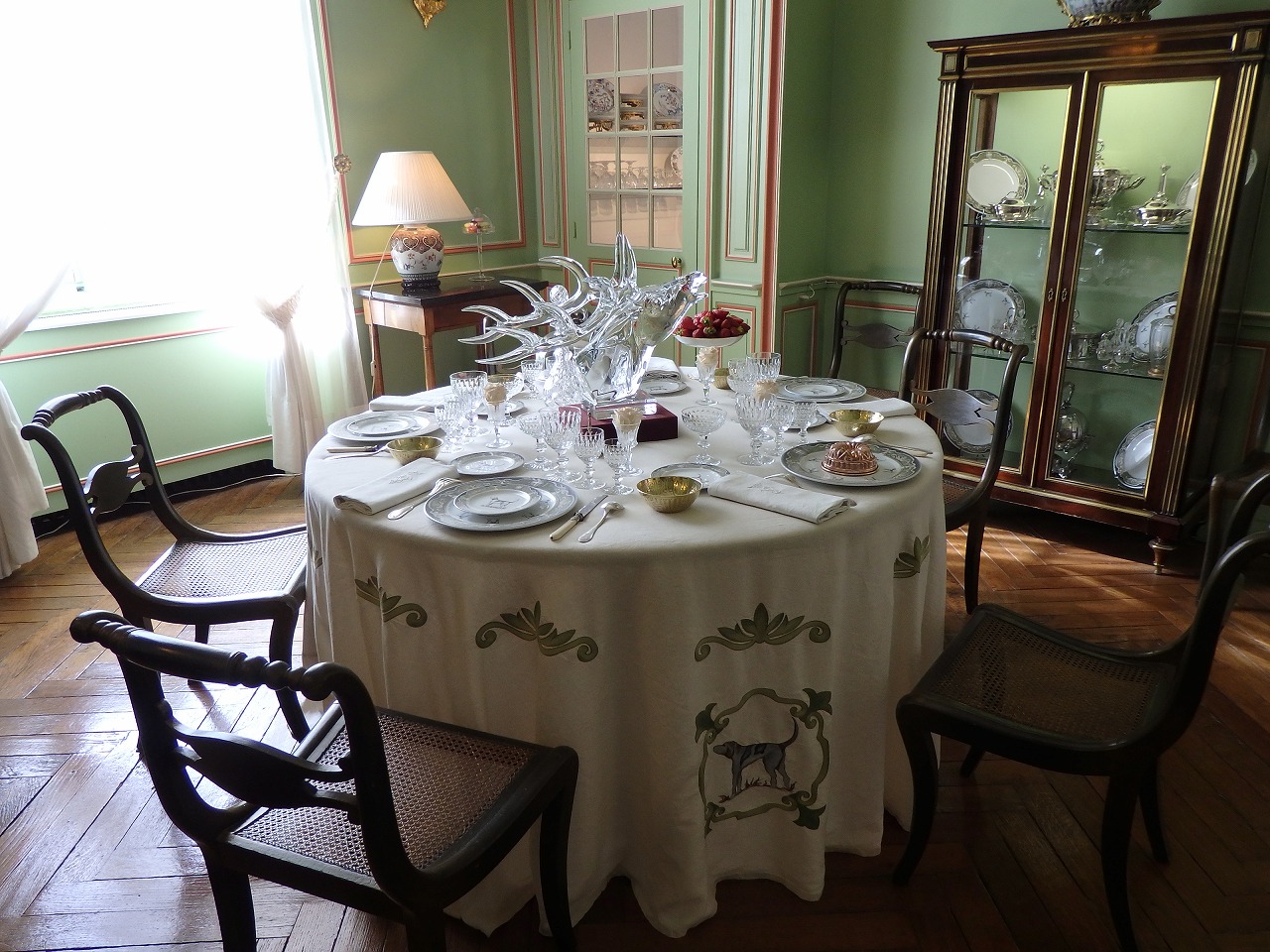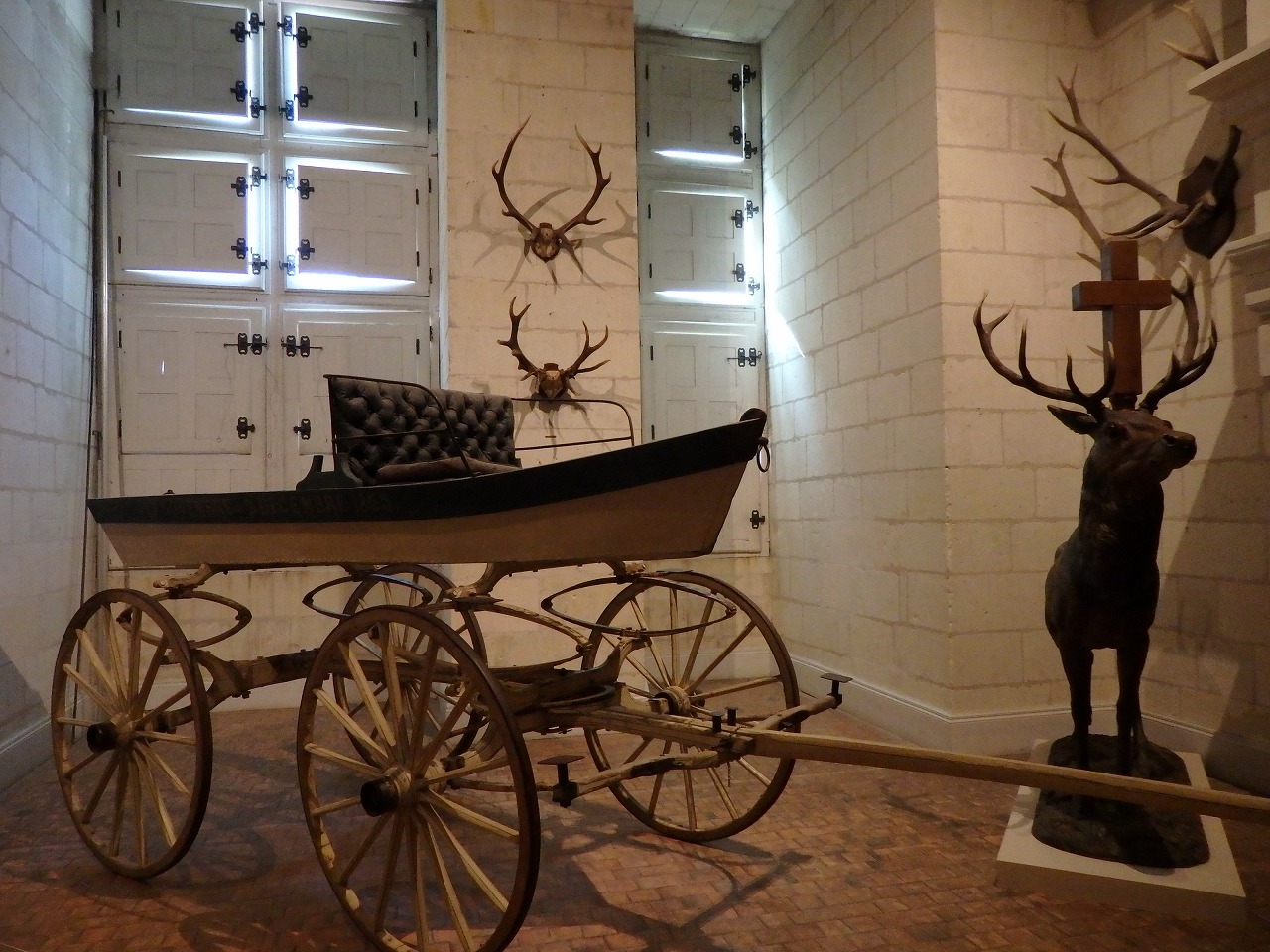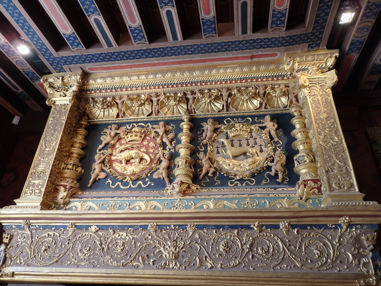 狩猟の離宮だったからね。こんな飾りがたくさんあります。広大な部屋、開放された窓、高い天井は暖房がほとんど意味をなさないことを意味しました。同様に城の周りには村や住居がなかったため、役に立つ食材は狩猟で採った動物のみでした。そのためすべての食材は大抵一度に2000名にも及ぶ人々によって運び込まれました。