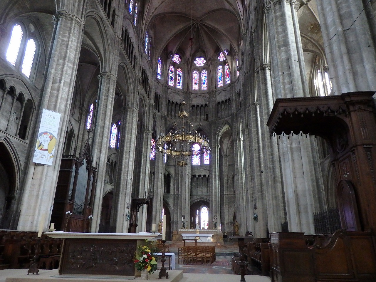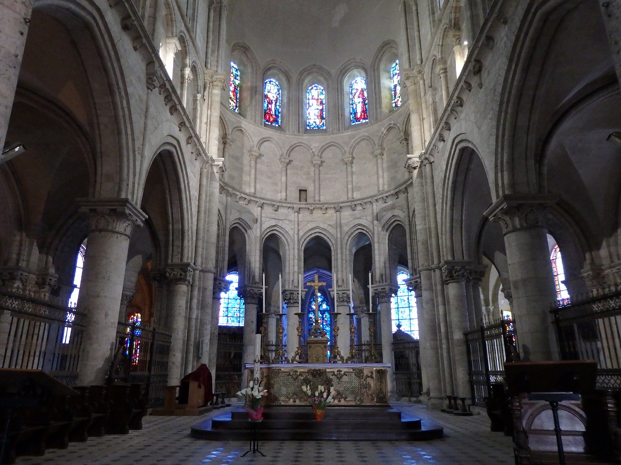 「内陣」 全体が石を切り出してつくられています。概してこの大聖堂は他の同様施設に比べユグノー戦争でも革命でも非常に少ない損害しか受けていません。場所のおかげで両大戦の損害からも比較的安全でした。