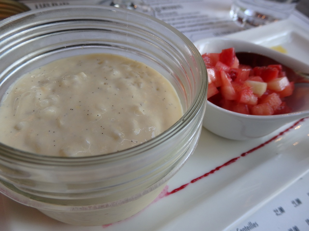 The dessert which boiled rice with milk. Sweet aroma of vanilla was absolutely wonderful. Strawberry and it were mixed to eat. It was a nice dessert. |