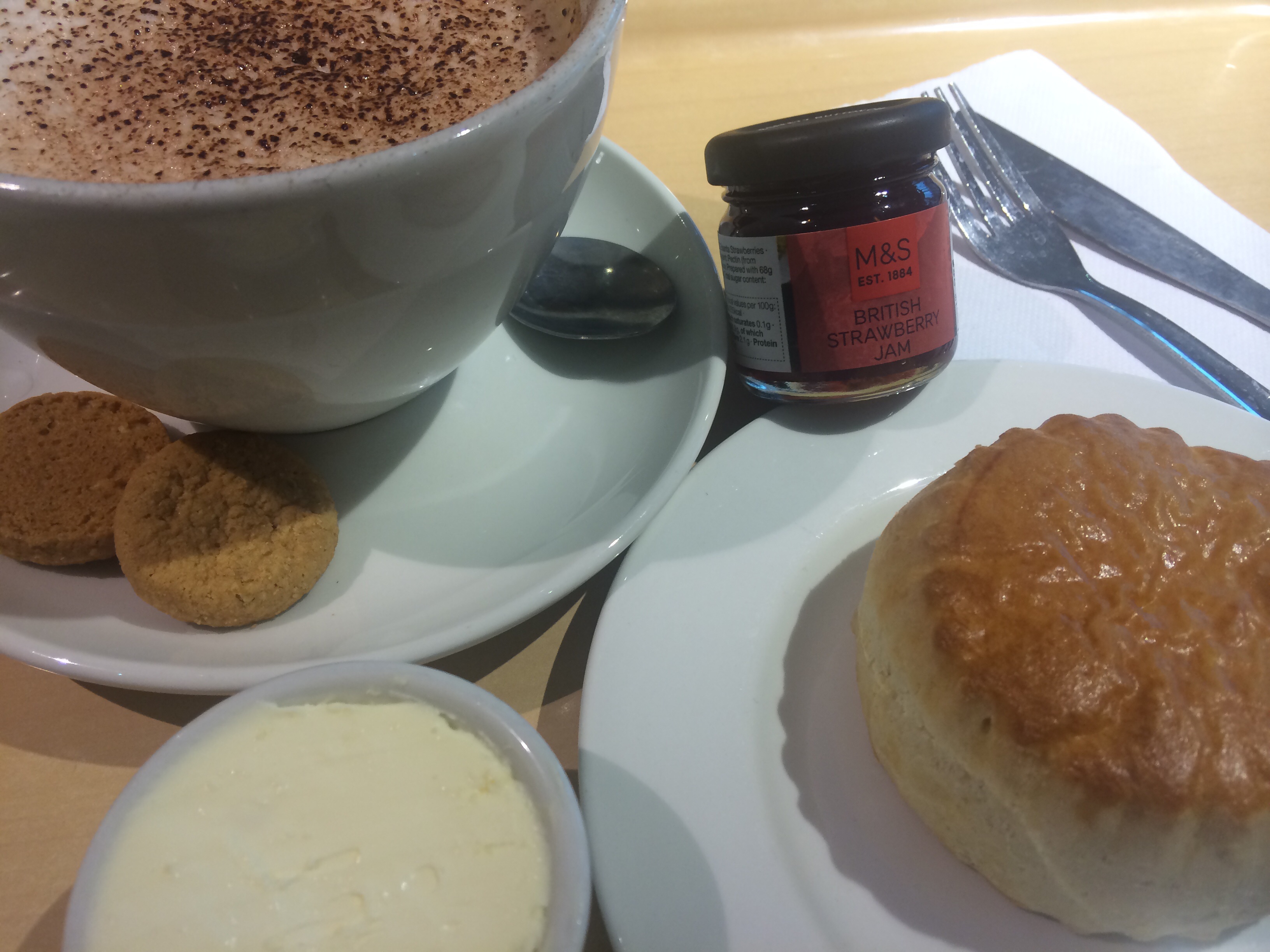 ランチの後、「マークス&スペンサー」のカフェへ。スコーンとでっかいカプチーノでおしゃべり。5ユーロぐらい。