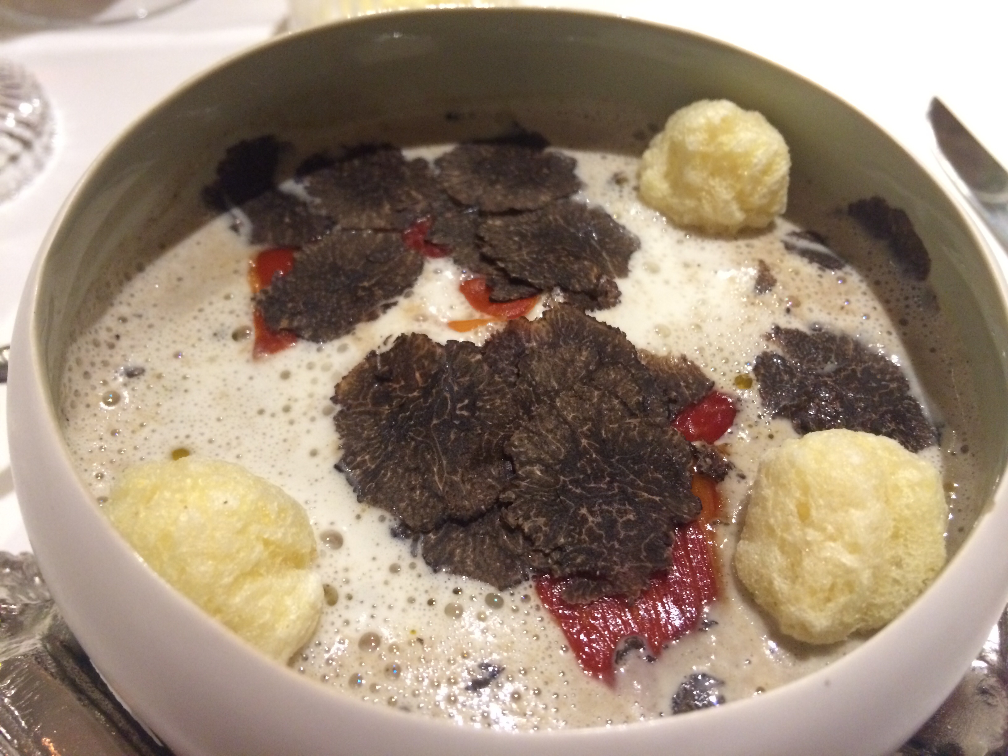 黒トリュフのスープ。中にはフォアグラ。ポップコーンが浮いています。絶品。