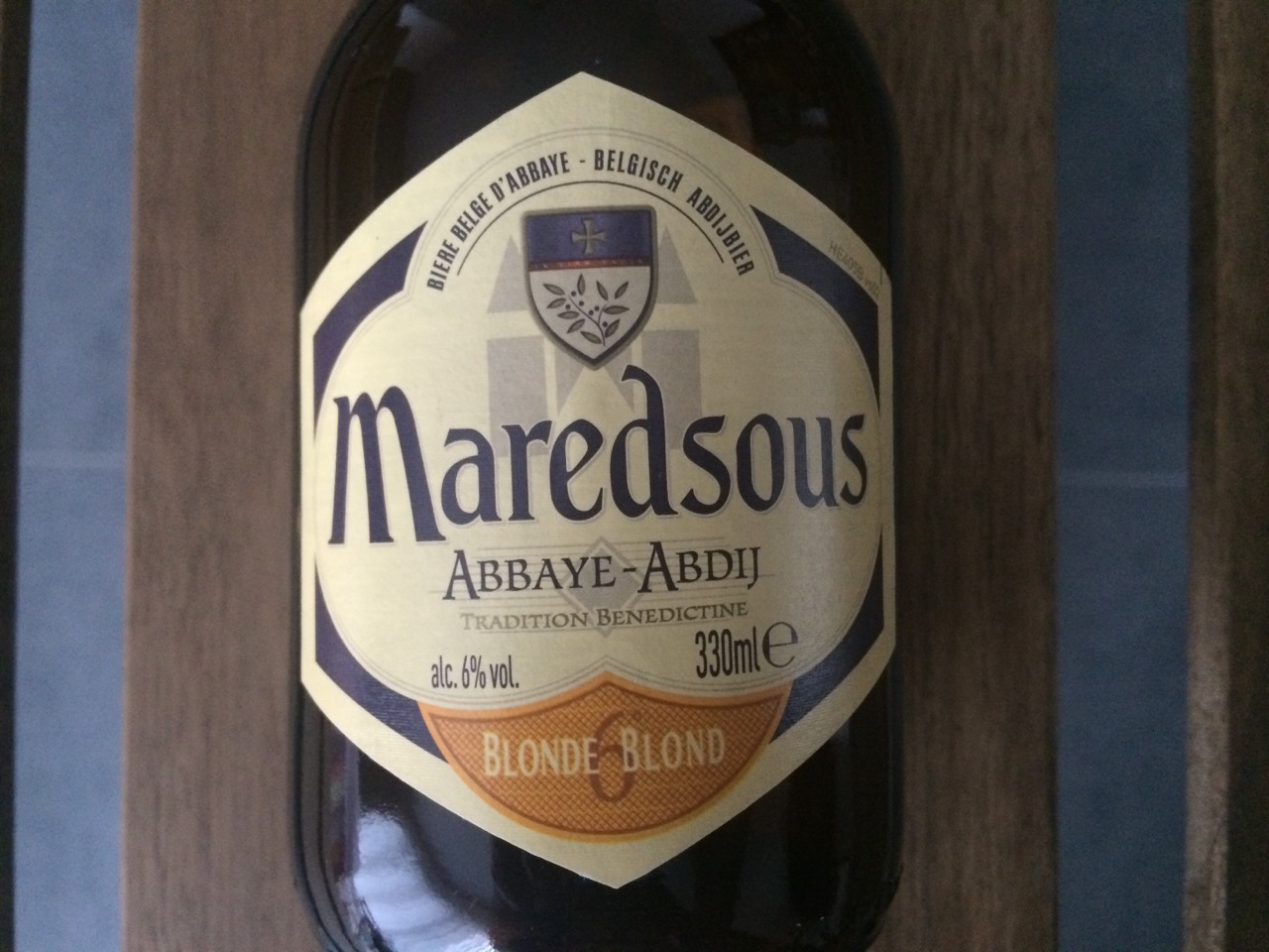 「マレッツ・ブロンド Maredsous Blond」 デュベル・モルトガット醸造所で醸造。金色っぽく明るいオレンジ色で大きくふわふわした白い泡が立ちます。強い酵母の香りがして、徐々にバナナと風船ガムの香りが少ししてきます。強い苦味と適度な酵母の甘さがします。アルコール度数は6%。
