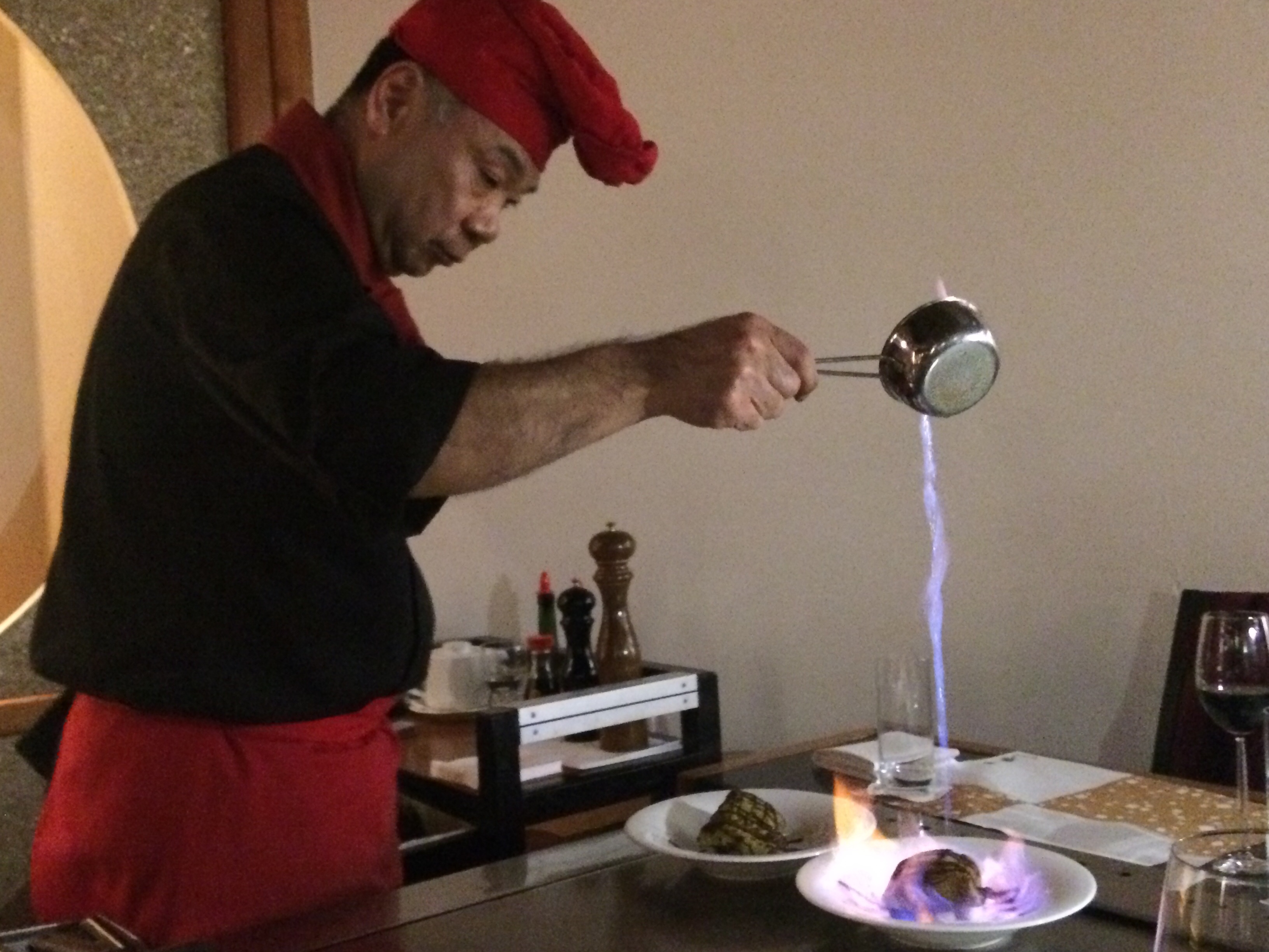 デュッセルドルフで週末を過ごしました。 日航ホテルの「弁慶」でお夕飯。お肉の仕上げ〜!