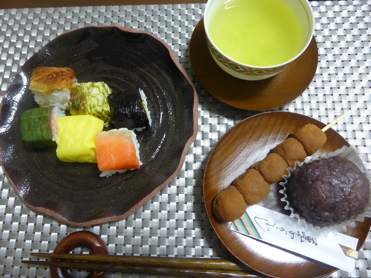 奈良「柿の葉すし本舗たなか」の「五条楽」とお団子とおはぎのお夜食。