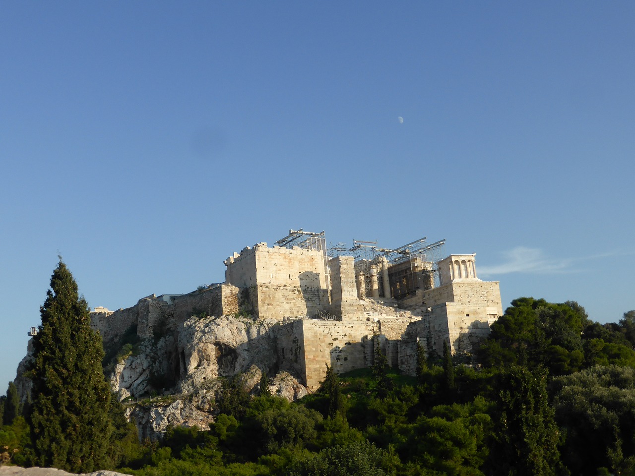 「プロピュライア」 アクロポリスの入口だったオリジナルのプロピュライアの上に建てられた記念碑的門です。紀元前437年に建設が始まりましたが紀元前431年のアテネ、スパルタ間のペロポネソス戦争勃発の結果、完成に至りませんでした。プロピュライアはギリシャ、ローマ、ビザンチン時代をそのまま生き残りましたが、1656年の火薬庫の爆発で大きな被害を受けました。2004年のアテネオリンピックの前にプロピュライアは修復のための足場で覆われましたが、2009年に足場は取り除かれました。