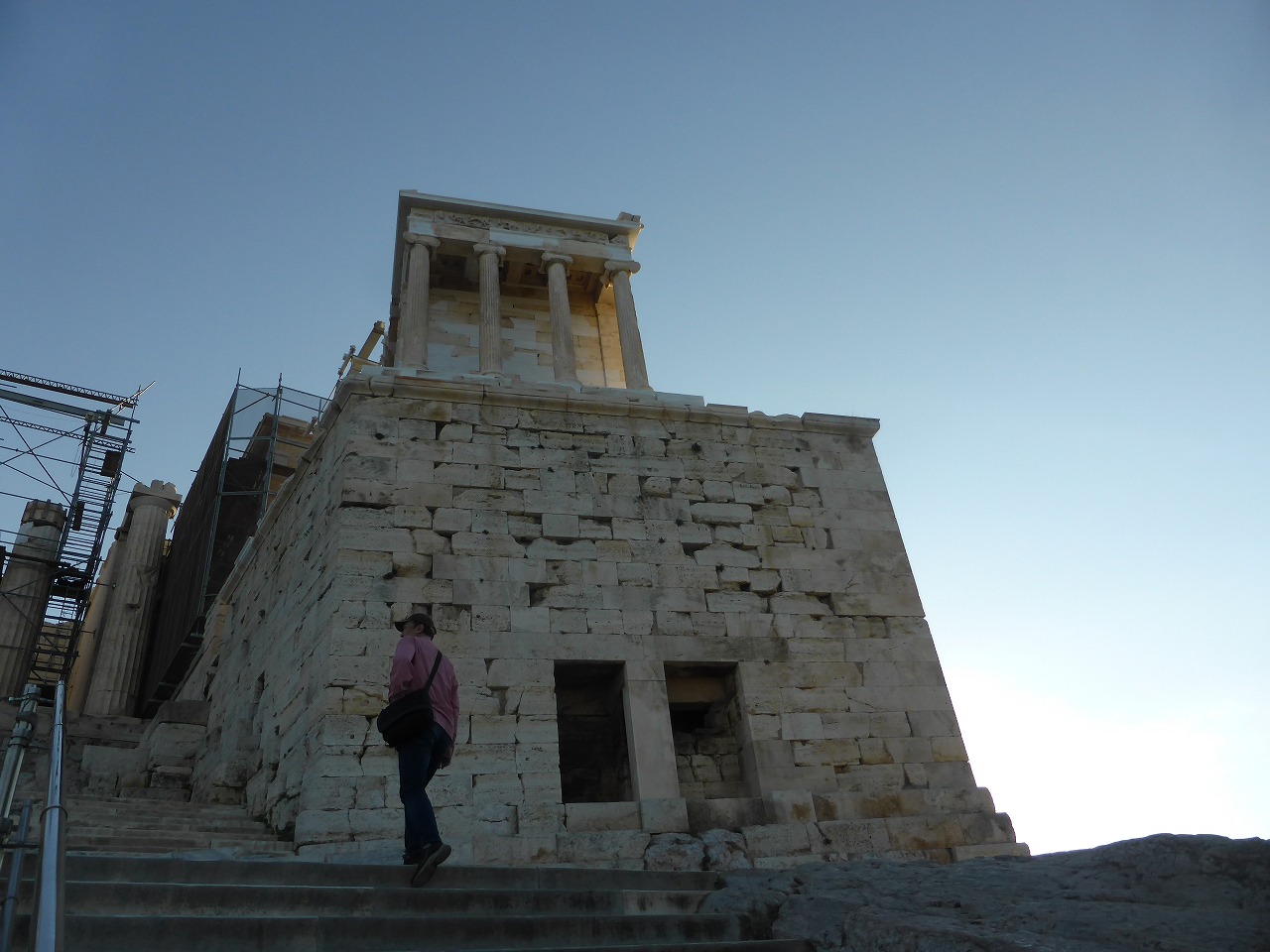 「アテナ・ニケ神殿」 紀元前420年頃建設され、ニケの勝利を祝うフリーズと守護神アテーナ/ニケを祭ったことにちなんで名づけられました。ニケはギリシャ語で勝利を意味しアテーナは戦争の勝利と知恵の女神としてその形で崇拝されています。神殿は1686年に防御壁を作る石として使うためにトルコ軍に取り壊されるまで手つかずのままでした。1834年のギリシャ独立の後、再建されました。1998年神殿は解体された後、コンクリート製の石段が置かれ、またフリーズは外されて2009年にオープンした新アクロポリス博物館に展示されました。