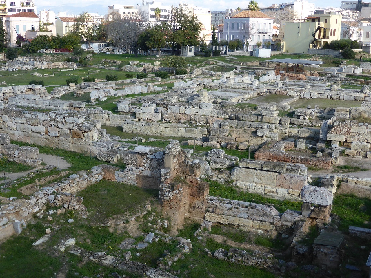 「アリオス・パゴス」から[古代アゴラ」 アレースは無罪放免されました。この催しによりここはその後、裁判の場所として有名になり、そのためアリオス・パゴス(アレースの丘)という名前が与えられたと考えられています。