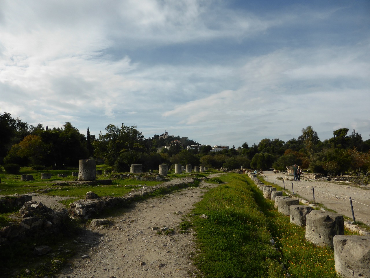 「展望台」から「ゼウス神殿」 ゼウス神殿の建設は紀元前520年頃始まりました。建設は紀元前510年アテネ専制が終了した時、放棄されました。その段階では土台といくつかの円柱の構成品ができていたのみで、その後神殿は336年の間そのままの状態でした。