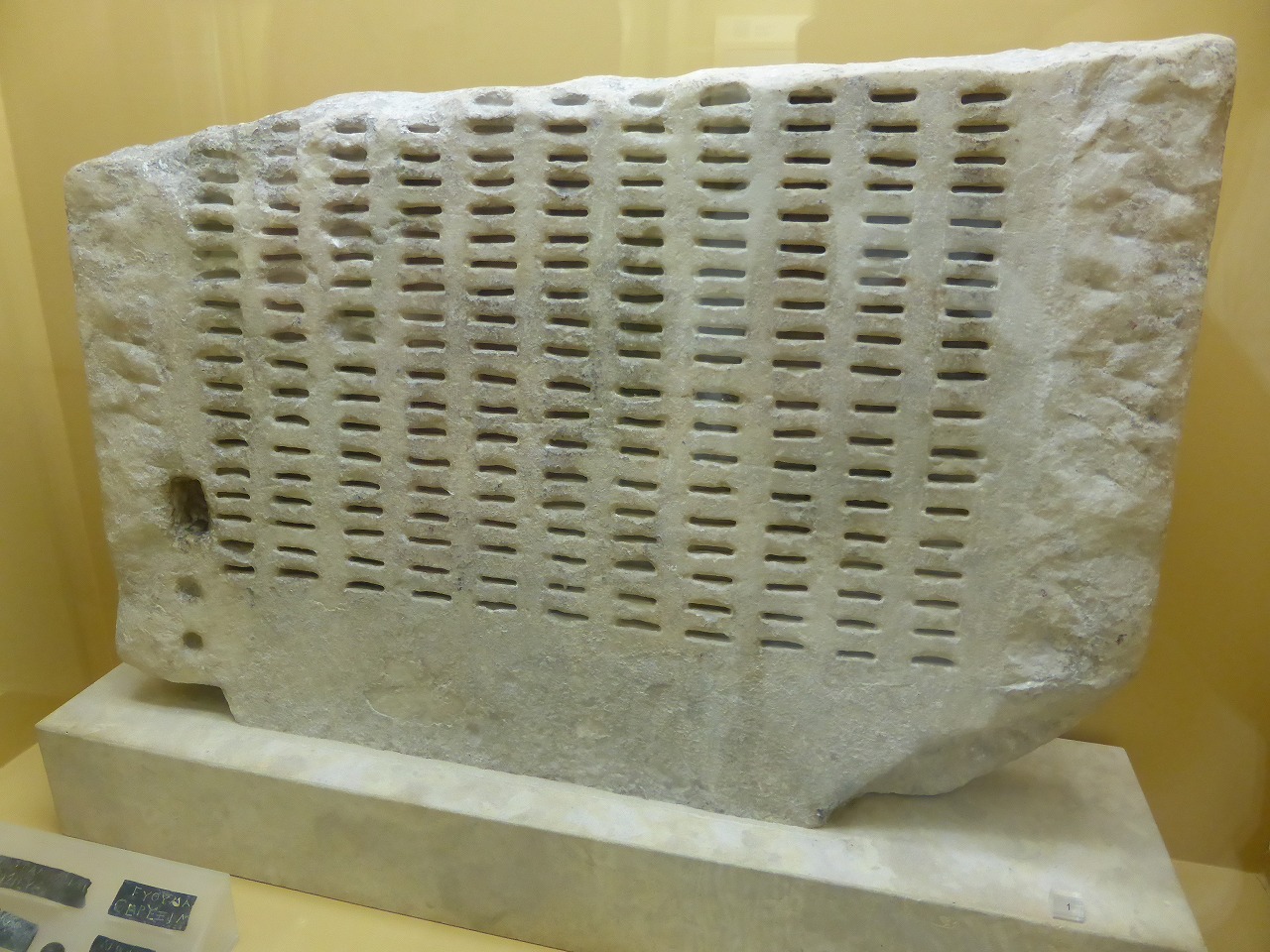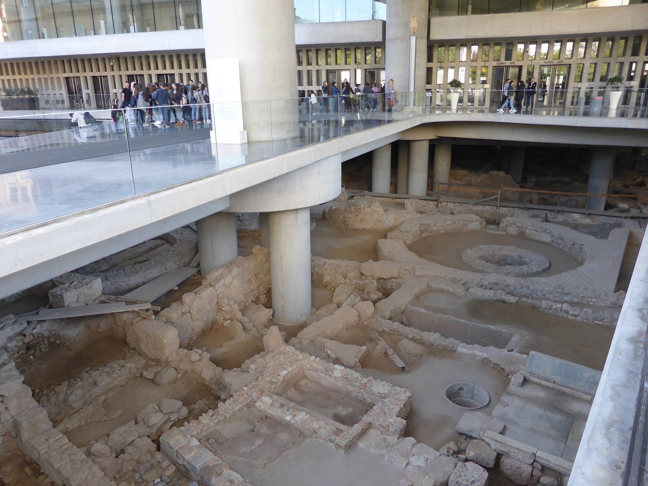 「アクロポリス博物館」 床のところどころがガラス張りになっていて建物の下にある遺跡が見られるようになっています。